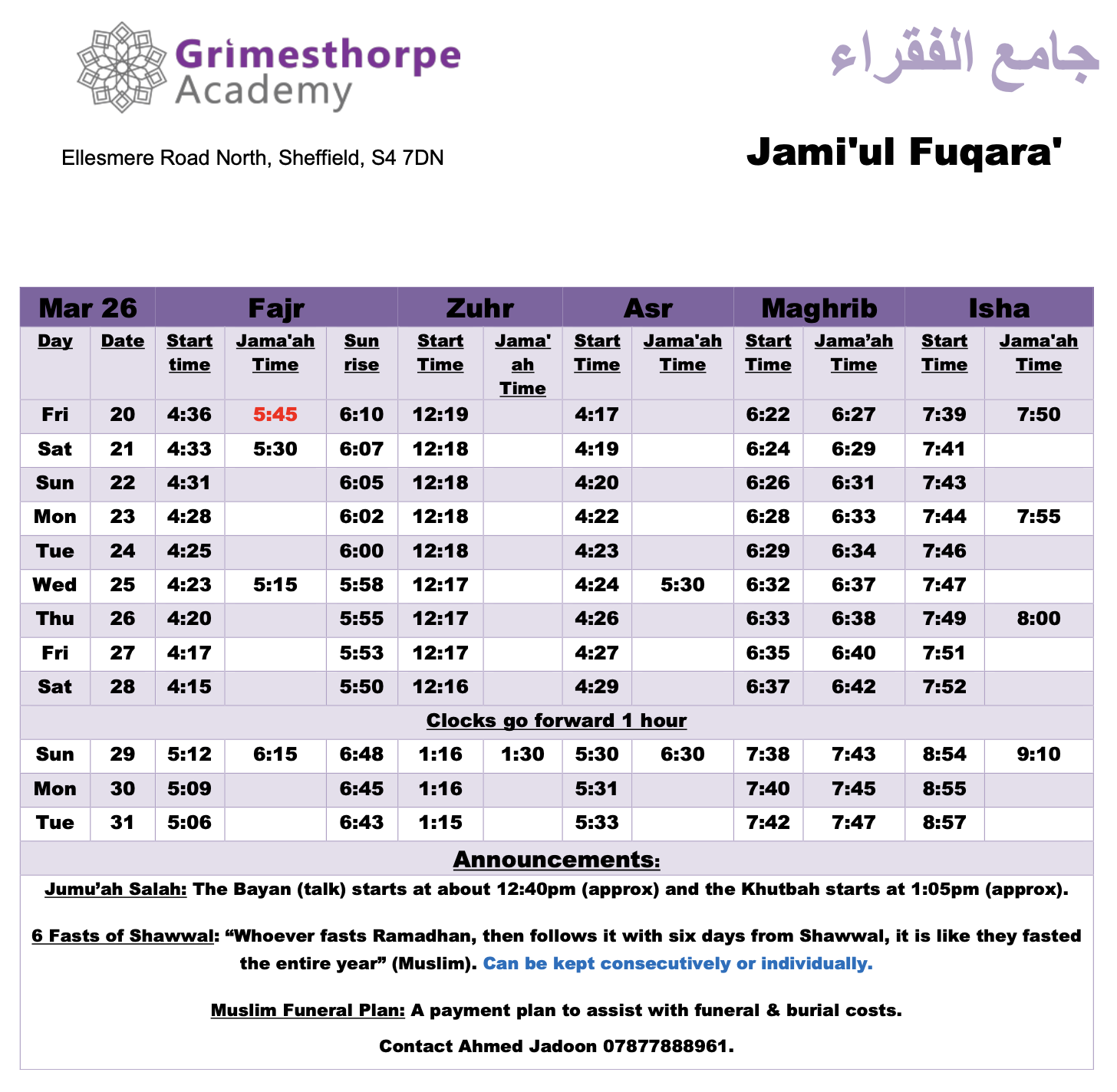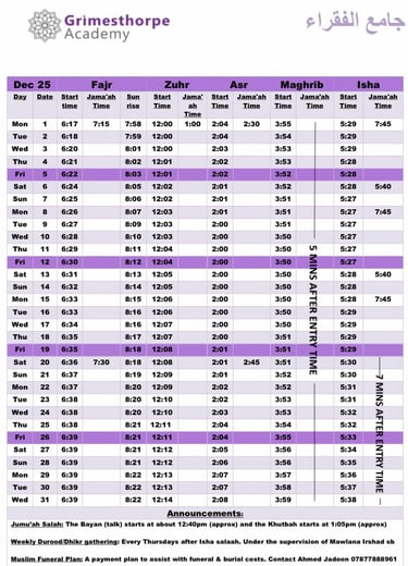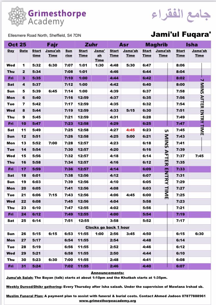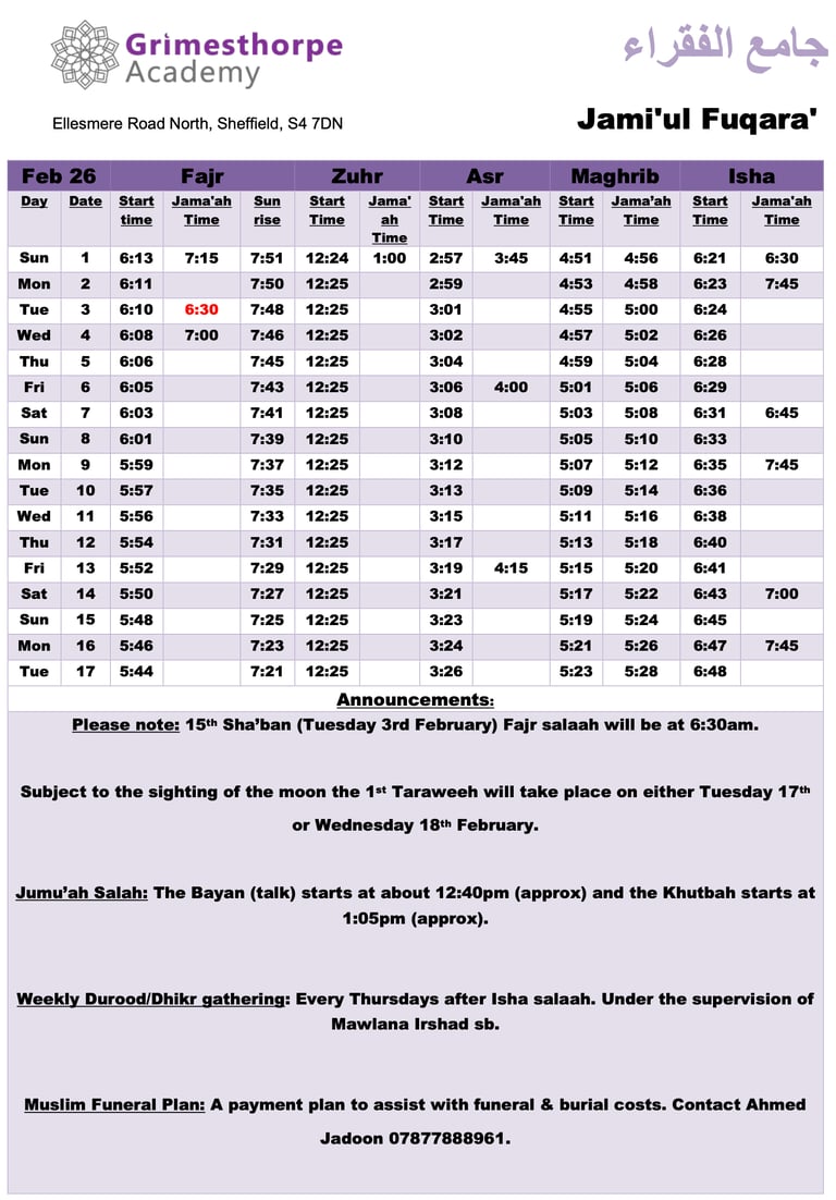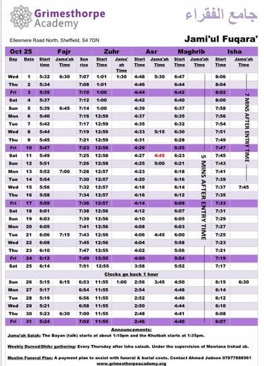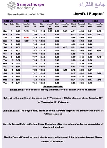 Jami'ul Fuqara with Grimesthorpe Academy serves the community by offering facilities for five daily prayers with congregation. There is a range of classes for adults and children to progress along the path of Islam.