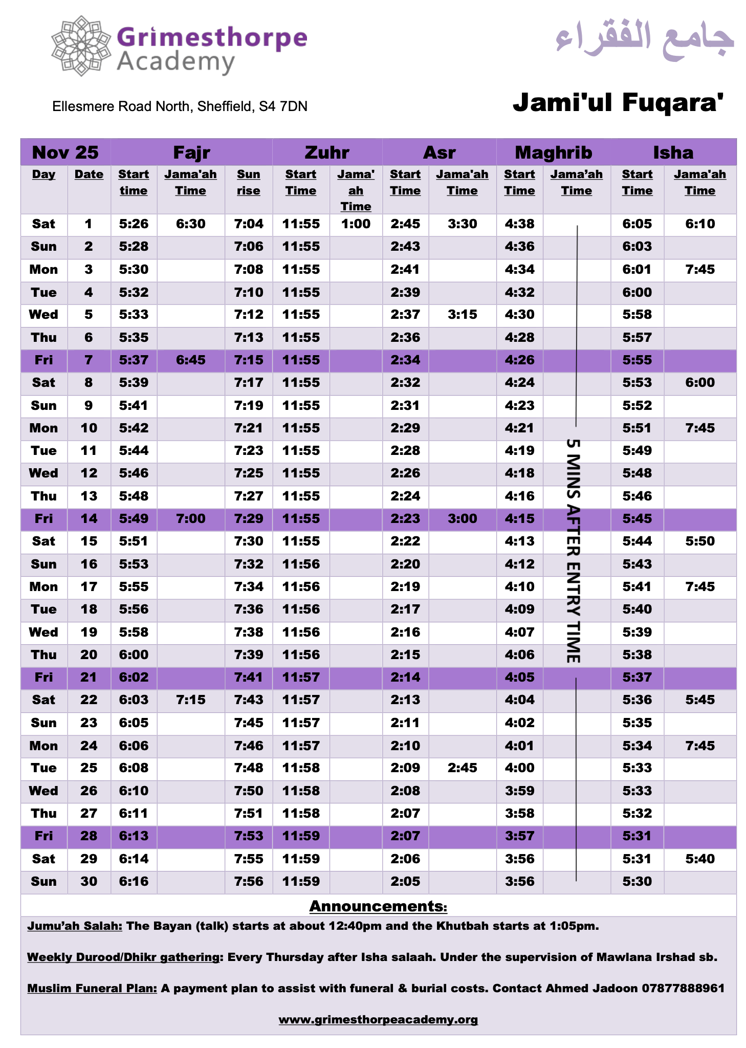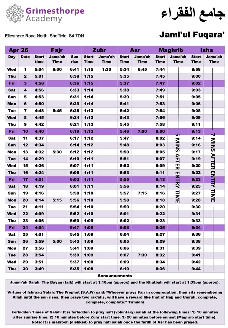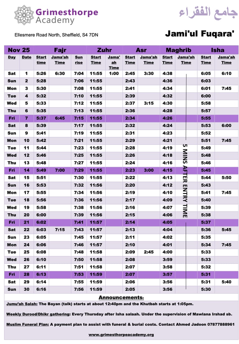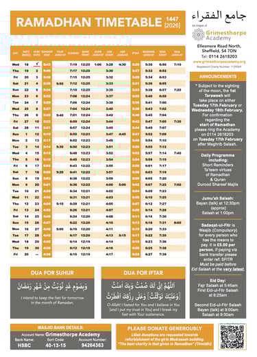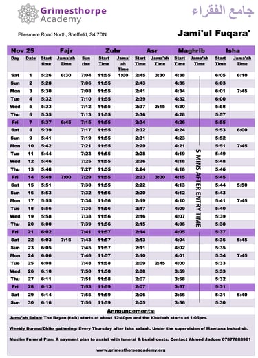Jami'ul Fuqara with Grimesthorpe Academy serves the community by offering facilities for five daily prayers with congregation. There is a range of classes for adults and children to progress along the path of Islam.